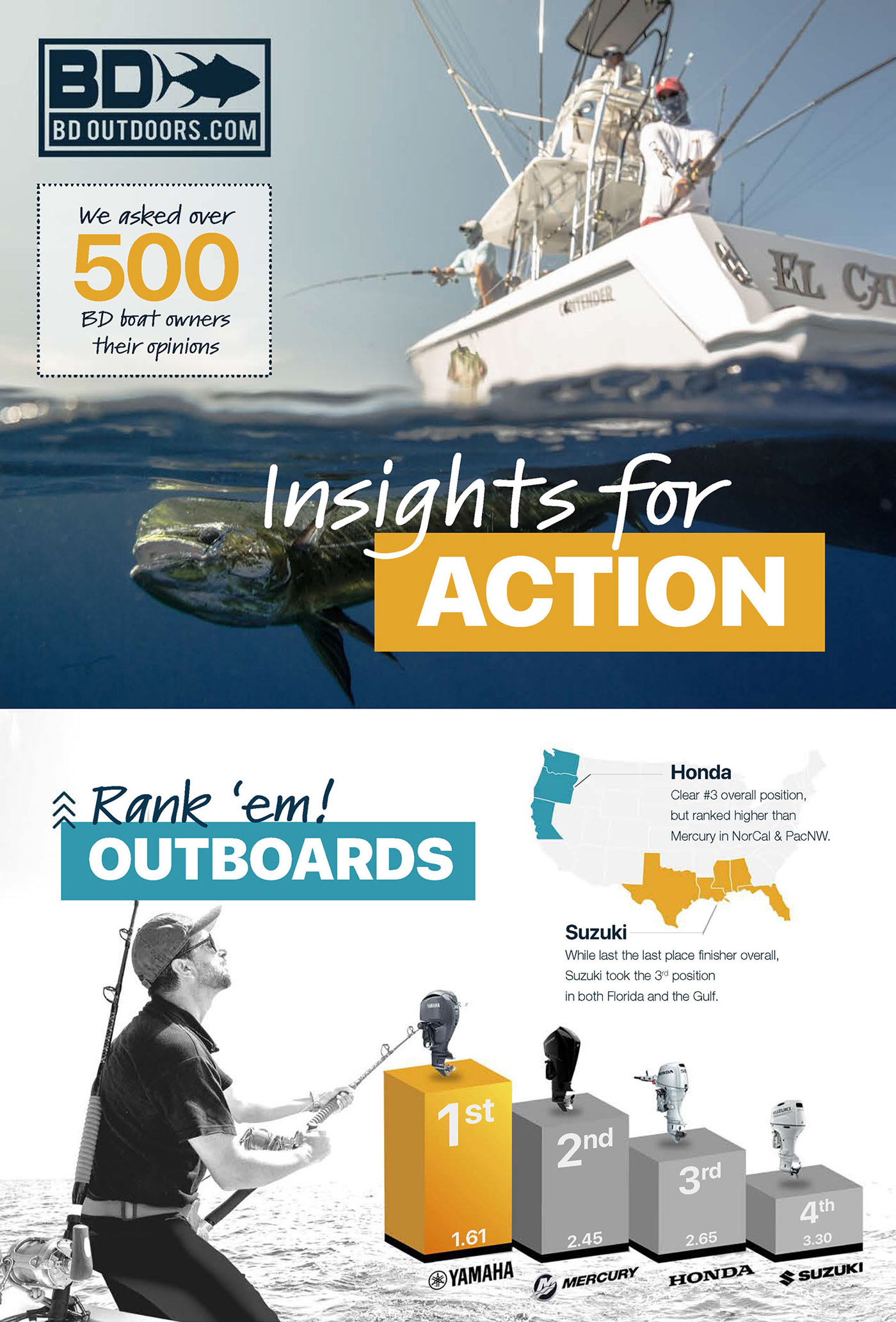 Here is a quick takeaway from our most recent survey which asked “Rank Em’” questions around electronics and outboards. A statistic not included in this infographic but one that we found interesting is that 52% over our core SoCal boat owners we interested in spot lock trolling motor functionality. There is a cool shift happening in the SoCal angling community, from the influx of the large center consoles to fishing techniques and gear selection –