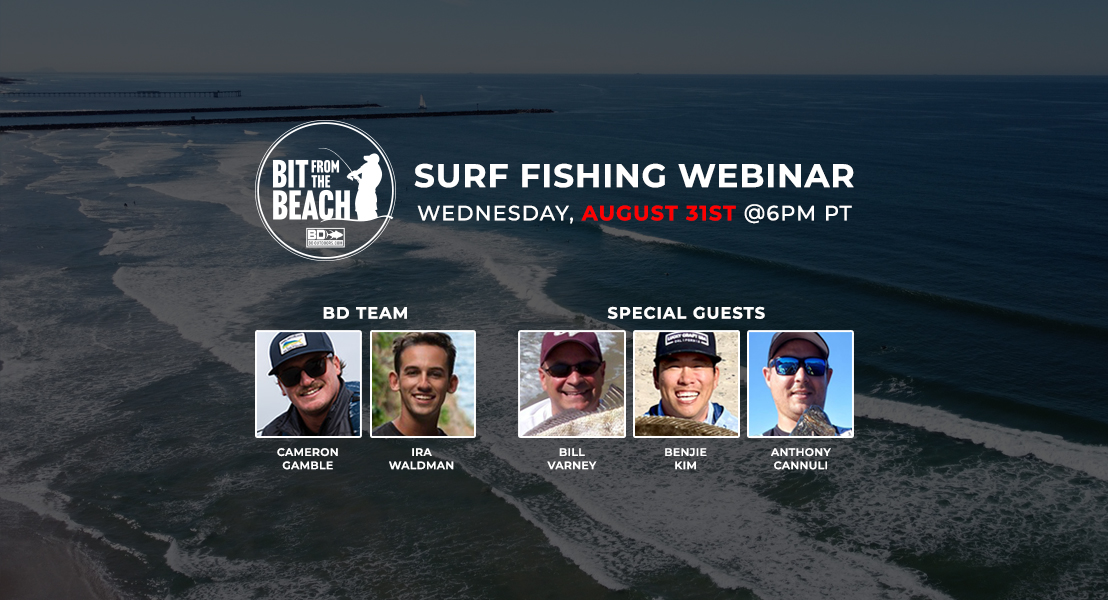 In the first episode of our newest webinar series Bit From The Beach, we had over 490 RSVPs for live audience members interested in Southern California Surf Fishing. This live stream was hosted by BD Staff Cameron Gamble and Ira Waldman, featuring three experts in the Surf Fishing Industry: Bill Varney, Benjie Kim and Anthony Cannuli. BD Outdoors and integrated brands helped share the knowledge of surf fishing with an engaged group of anglers, proving episode 1 to be a great success.